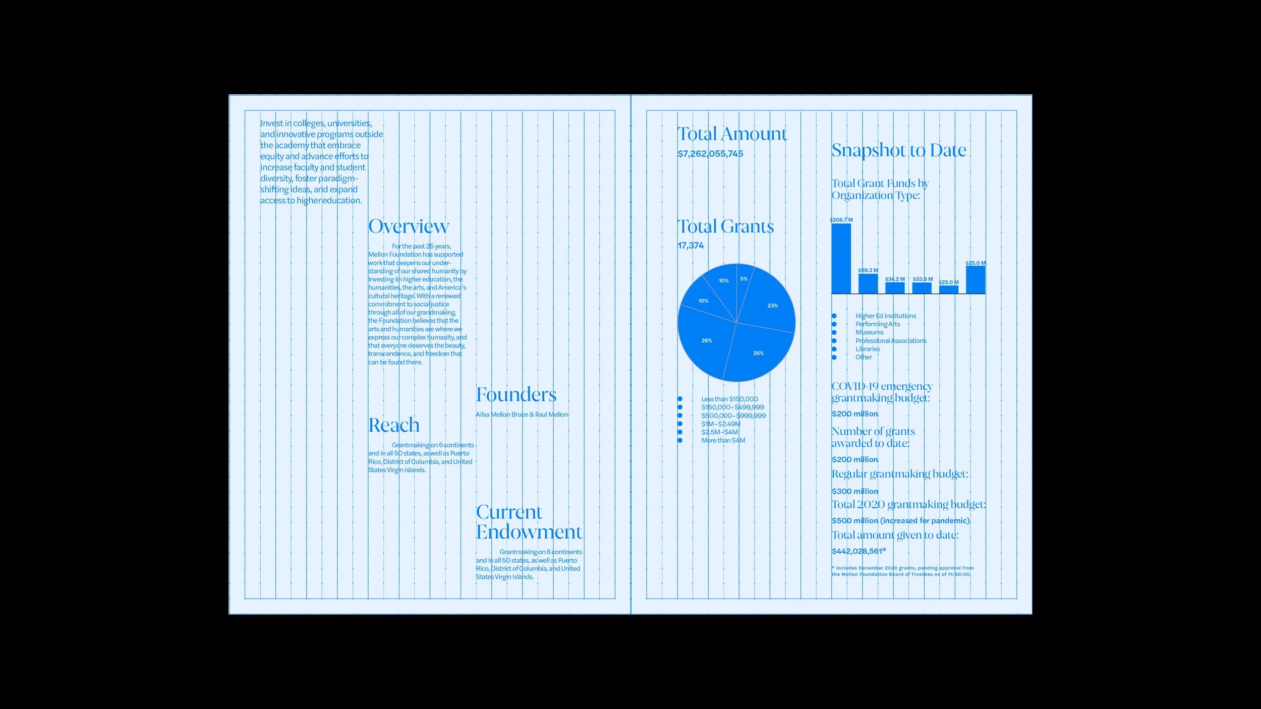 Established grids, placed images, and clear space work together to create a narrative around which the Mellon M can be woven throughout. By allowing the M to interact with images in this way, we underscore how Mellon elevates its grantees.